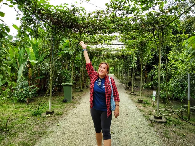 Upon arrival to the farm, we boarded the truck which brought us into the orchard. The truck dropped us off at the Dragon Fruit section where we learned some facts about Dragon Fruit… Then we continued across the lane to a shady path, thanks to all the passion fruit plants which had grown on the trellises over us, which provided a pleasant shade, not that it was necessary as it was evening and it was drizzling…