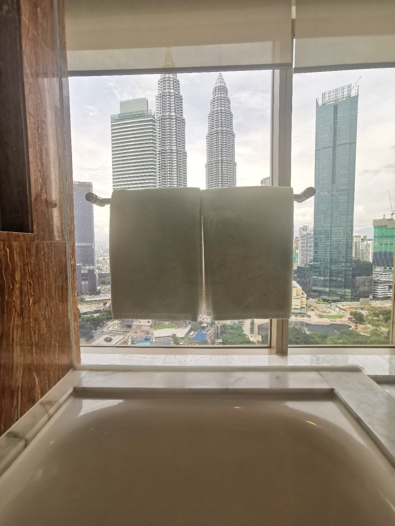 The impressive part of the room would be the marble-clad bathroom complete with a dressing table, bathtub and rain shower all boasting a spectacular view of the Petronas Twin Towers…