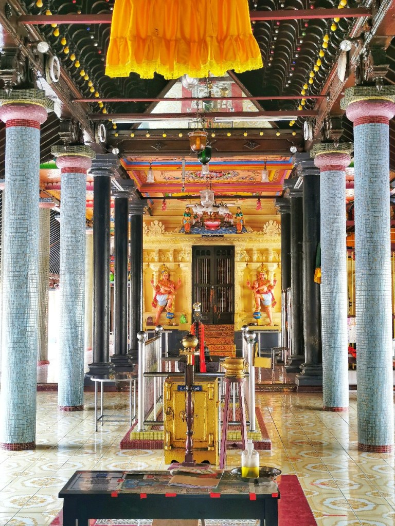 The reticent front opens into a pillared hall with a polished terrazzo floor. Light floods into the open main prayer space through rows of columns with carved capitals carrying dark polished timber beams. Over the ceiling span richly carved timber joists – fine woodwork is a typical feature of Chettiar temple architecture.