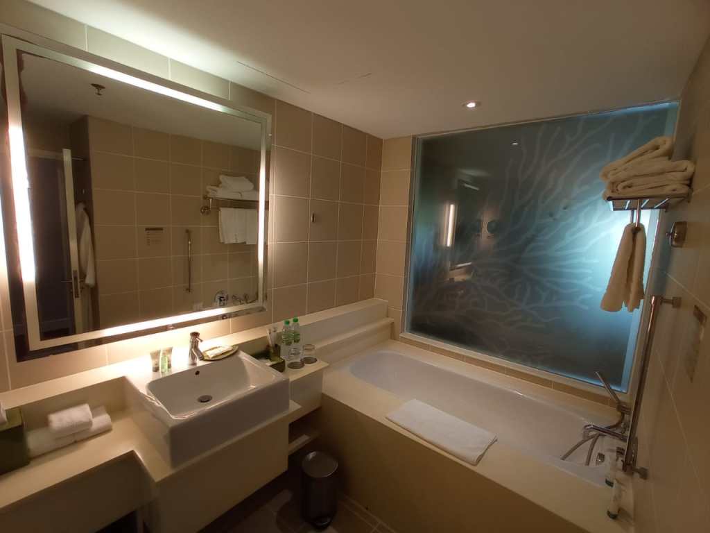 The ensuite bathroom in the bedroom is made with marble, and comes with Heavenly® Spa bath amenities and plush robes and a bath tub, though my friend is disappointed as he preferred a modern bath tub or one that came with a view…