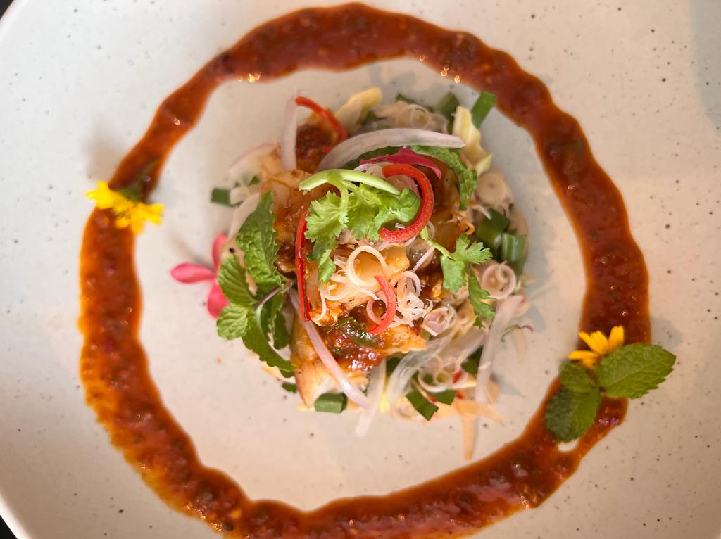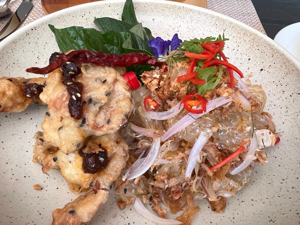 The next dish up was the Yum Som O Poo Nim Thord (THB 390). This was a delicious refreshing pomelo salad served with crispy soft shell crab…