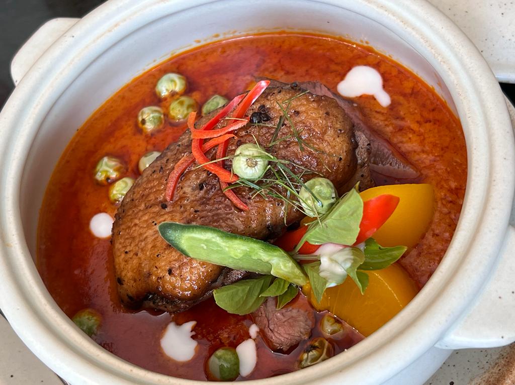Then came Gaeng Cour Ped Yang Look Peach (THB 490) which was actually Roasted duck which was cooked in a combination of red curry and some dried fish… there were some peaches inside the dish and initially I really did not want to eat this as the ingredients sound super weird…