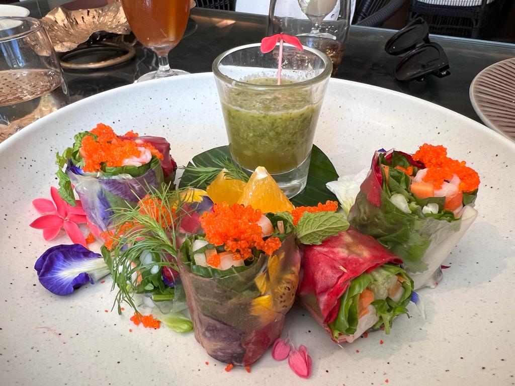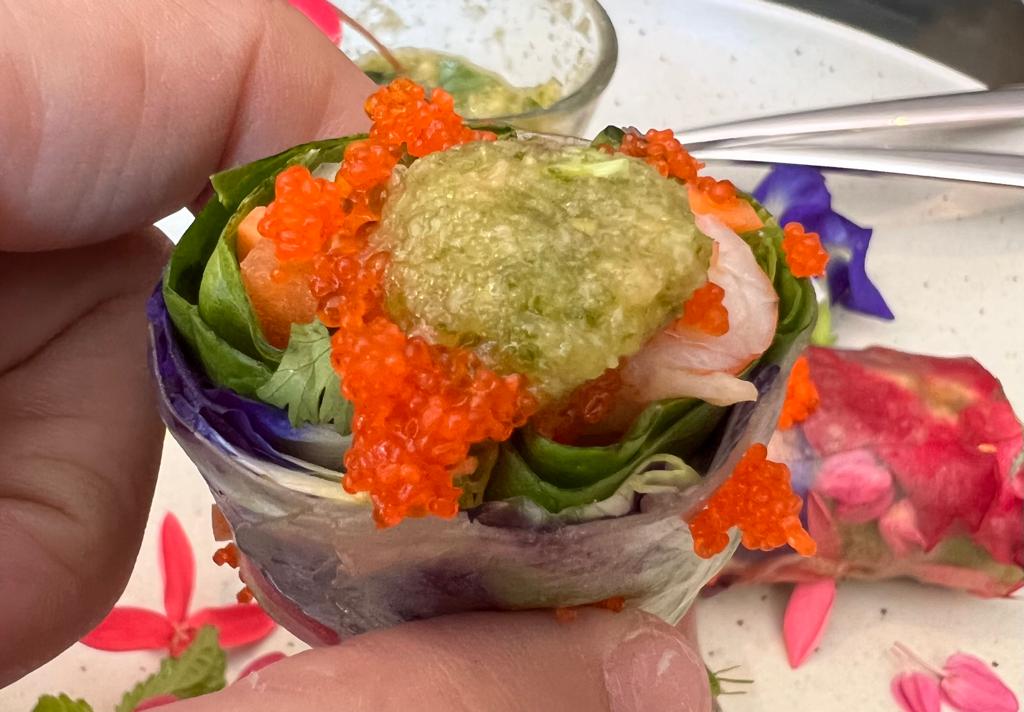 Our royal meal started off with some appetizers – and we had the Poh Pia Dok Mai (THB 390) . This soft rice paper roll was willed with Amaebi shrimp and edible flowers including butterfly pea flowers and it looked soooo pretty, it was almost a crying shame to eat it….