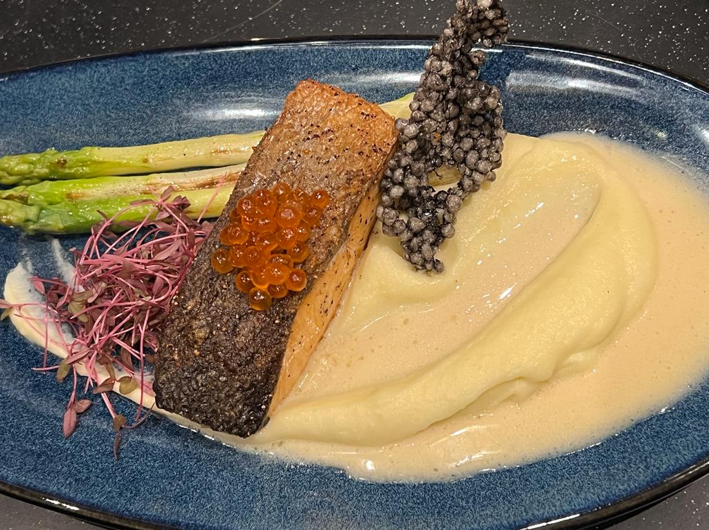 The other dish for our main was the oven-roasted Scottish salmon ( THB 690) that came with super smooth mashed potato & ginger, asparagus, salmon caviar, beurre blanc sauce…