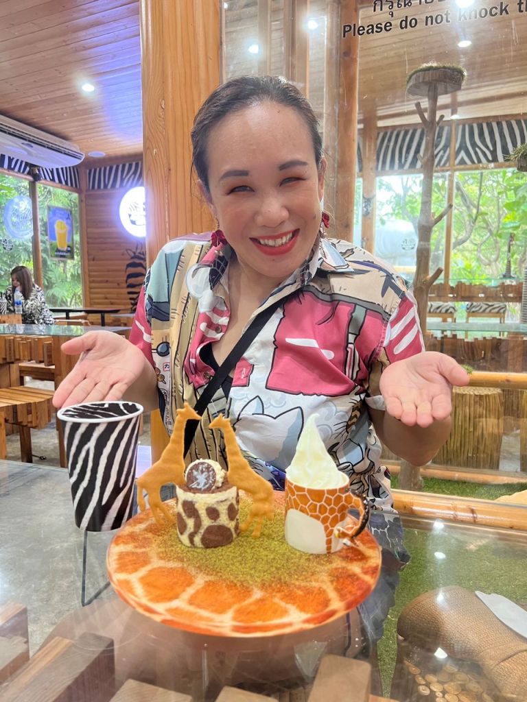 The dessert served here are animal themed and definitely taste really good … I ordered the Iced Zebra Chocolate (THB 120) which was one helluva delicious iced chocolate drink with velvety looking zebra stripes made from bamboo charcoal powder and the Giraffe Terrace (THB250) which came with Tiramisu Cake, Vanilla Soft Serve and Giraffe shaped cookies… my friends ordered the Mango A Co-Co (THB 250) which came with the Famous Thai Mango Sticky Rice and Mango Pudding and Elephant Split (THB 220) which came with Chocolate Banana Sundae, Banana chips and Elephant shaped cookie….