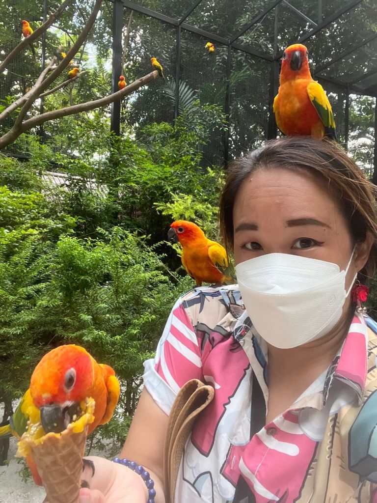 Grab an “ice-cream” for the birds and enter the Tree House Aviary where you can feed some of the hundreds of free flying brightly coloured sun conures/parakeets which will come and land on your hand to peck at the “ice-cream”…