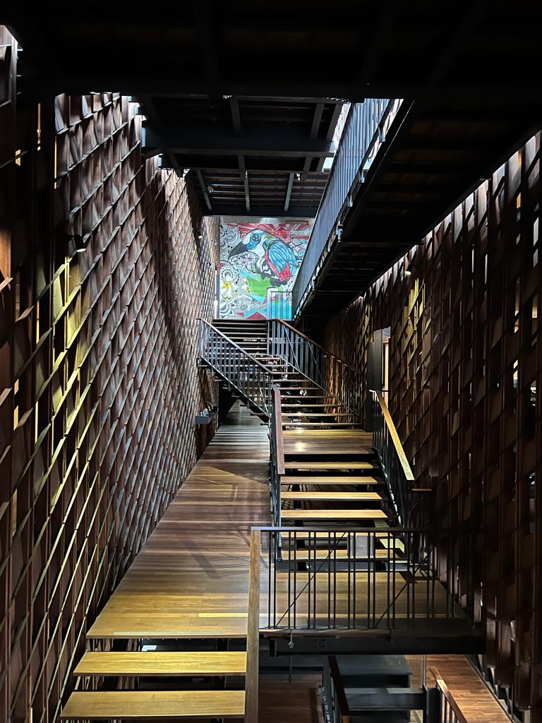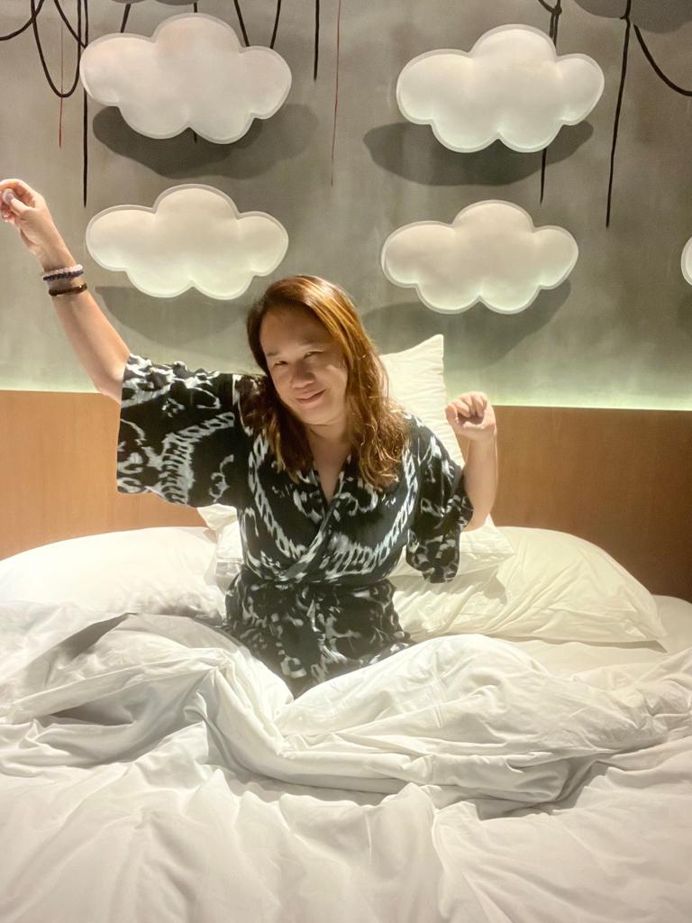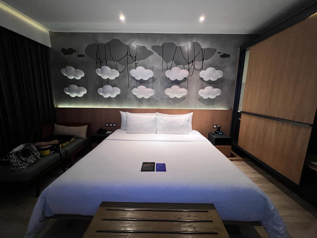 The room I stayed in was Studio 30, and my room was designed and painted by Made Valasara and includes his signature embossed technique creating white fluffy clouds that are suspended upon the wall to which he has depicted random greys clouds and red angular forms representing kites and black lines as the chords… making it feel as though I was cloud 9, specially when am snuggling on the cosy bed with exclusive ARTOTEL Bedding Collection…