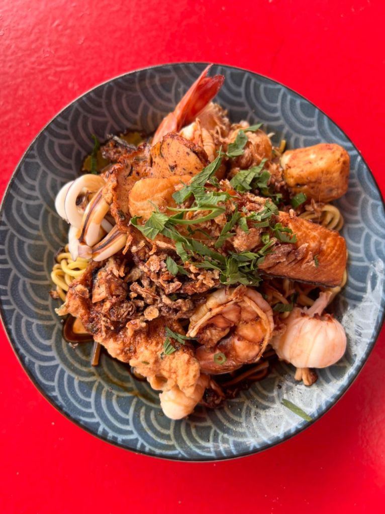 To be honest I am not sure how much but we ordered 3 of these noodles -different but it came heaped with fresh seafood, one plate of fried wonton -which was also generously filled with fresh chicken and prawns, and drinks and the bill was just RM60++