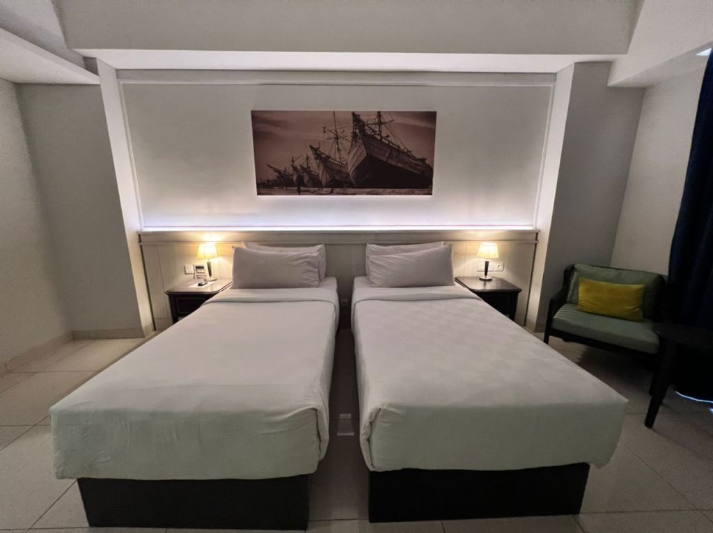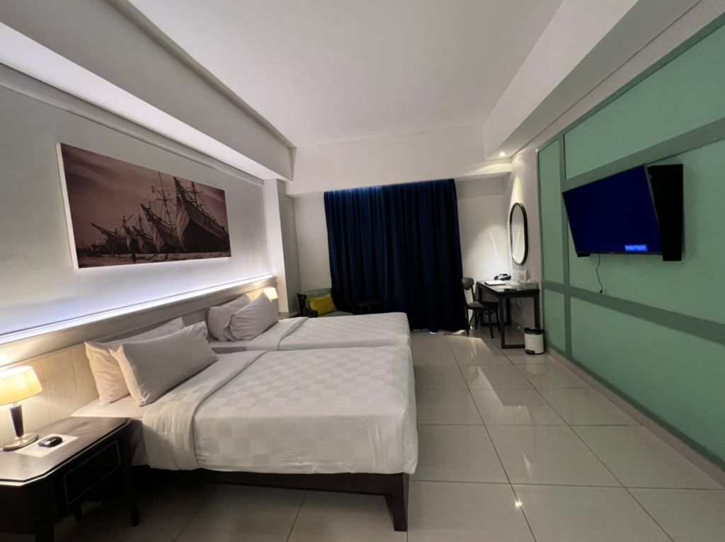 My room was pretty spacious at 35 square meters, and pretty in shades of white and hints of tiffany green/tosca green, and a big photo of Old Town Jakarta Sunda Kelapa Harbour with the majestic looking huge sunda boats at the wall behind my bed…