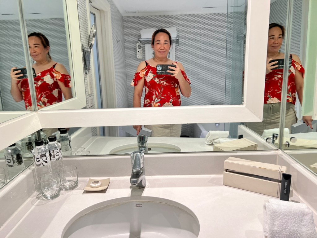 The room was so clean in all white and came with bathrobe, slippers, amenities and a bathtub the two of us appreciated!!!!