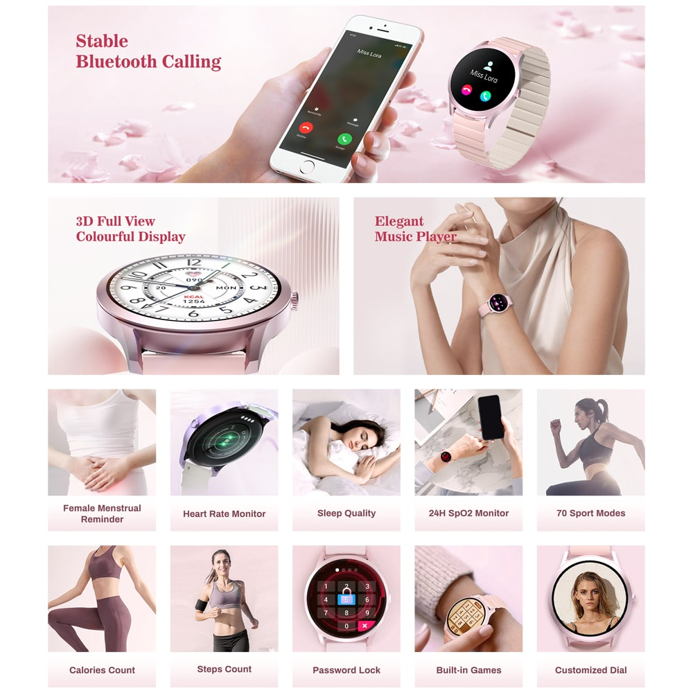 You can find all the standard features found in smartwatches, such as stopwatch, alarms, timer, weather forecast, flashlight, quick message reply, calculator, camera control, password protection etc, but the Kieslect Lady Calling Watch Lora really stands out with its 3D Full View Colourful Display.