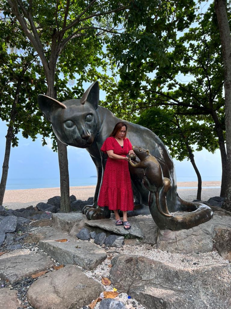 Samila Beach is a 3 km stretch of white sand beach in Songkhla in Southern Thailand. It is about a 45-minute drive by from Hat Yai, Thailand. And you probably can get a taxi or tuk-tuk driver to fetch you from your location and bring you back.