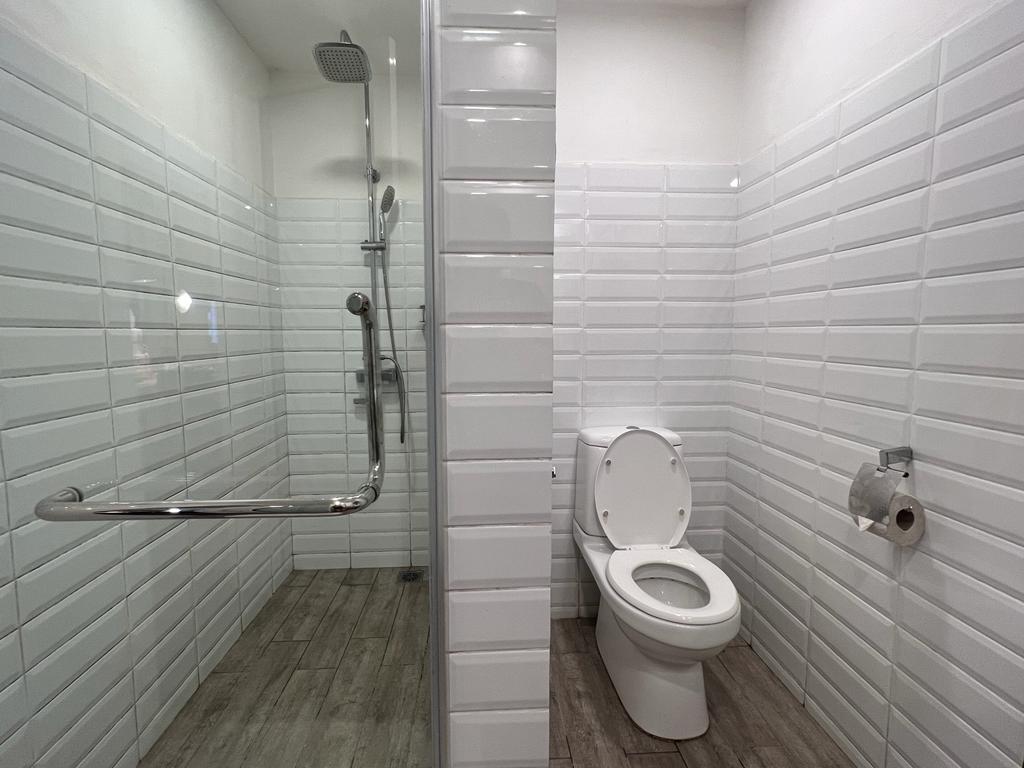 The bathroom was clean and white and cane with a hand held shower and also a large rain shower head.