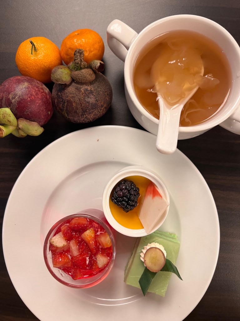 The lavish dessert spread offers an array of cakes and pastries, such as Sticky Banana Pudding, Pandan Cream Cake, Crème Brûlée, Chocolate Cake, Mango Tartlets, Strawberry Cream Cheese Cake and Coconut Tart, as well as Malaysian kuih like Kuih Laps, Pulut Inti, Kuih Koci, Kuih Bingka Ubi and Kuih Talam.
