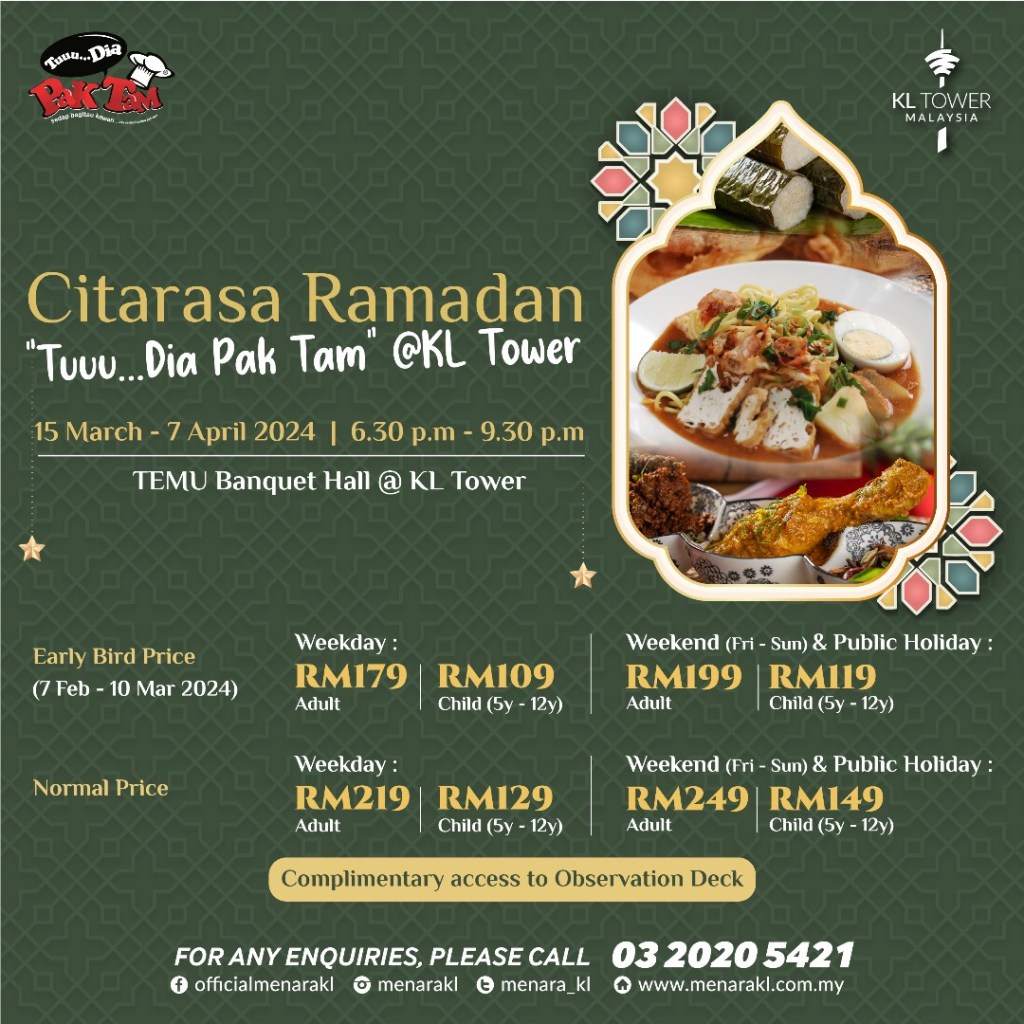 Engage yourself in the spirit of togetherness as we present a lavish spread that transcends taste, bringing families and friends closer during this special month. Join us for an unforgettable feast that celebrates the essence of Ramadan at KL TOWER, where each mouthful narrates a tale of dedication and excellence, creating a memorable dining experience,” said Mr. Ruslin bin Ibrahim, Chairman of Pak Tam Katering Sdn. Bhd.