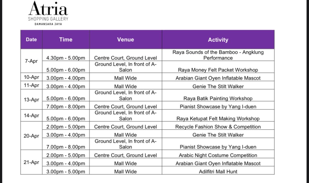 Have a good time at Atria Shopping Gallery’s Raya Centre Court, Ground Level, share it on social media, and hashtag #TheLumniousRayaAtAtria #AtriaDJ.