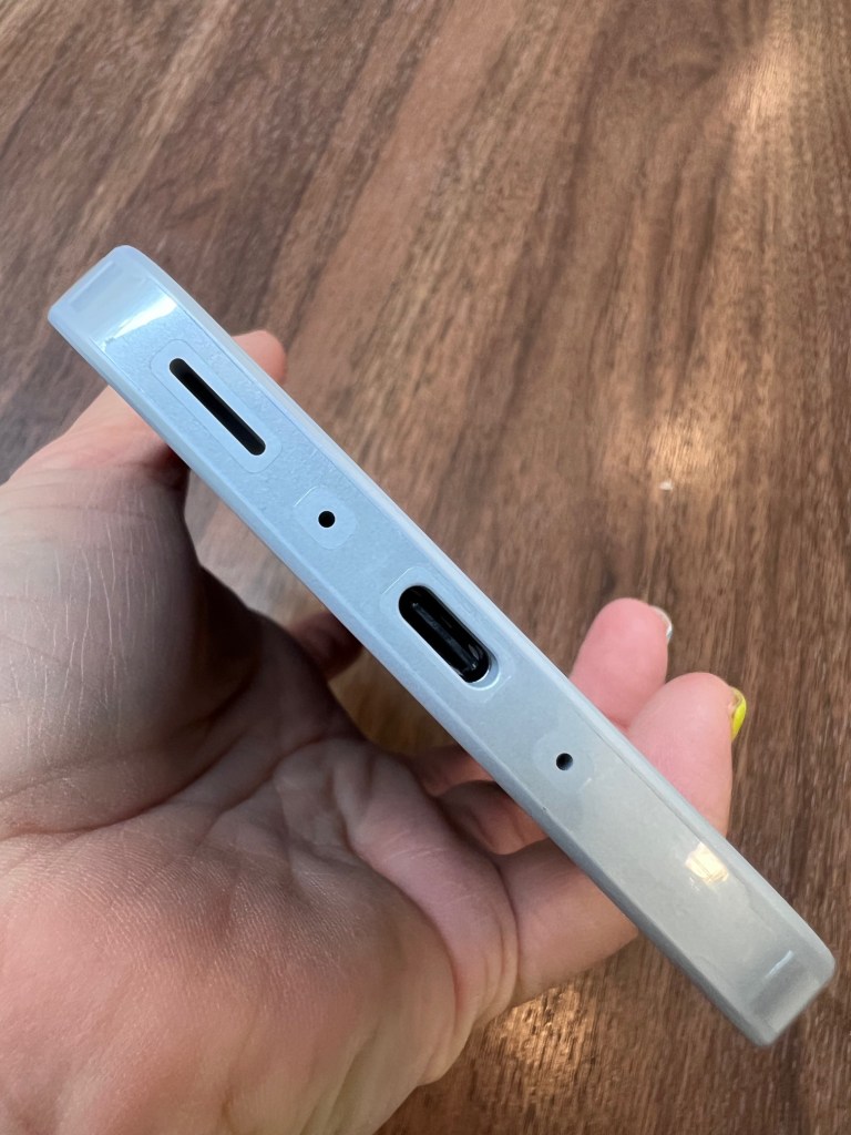 It has the same straight edge as the Galaxy A55 5G and Galaxy S Series and comes with a matte edge that is comfortable to hold, and my Ice Blue phone looks pretty cool in a light pastel blue kinda shade…..
