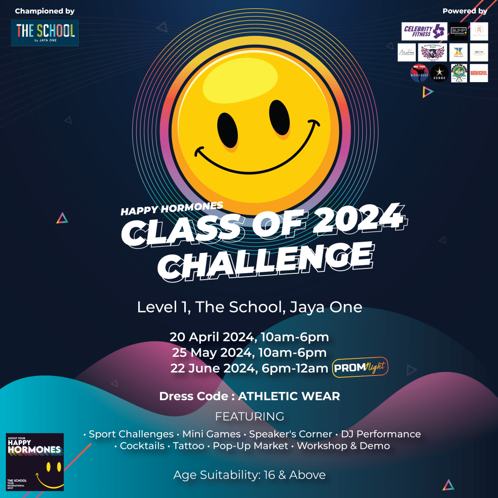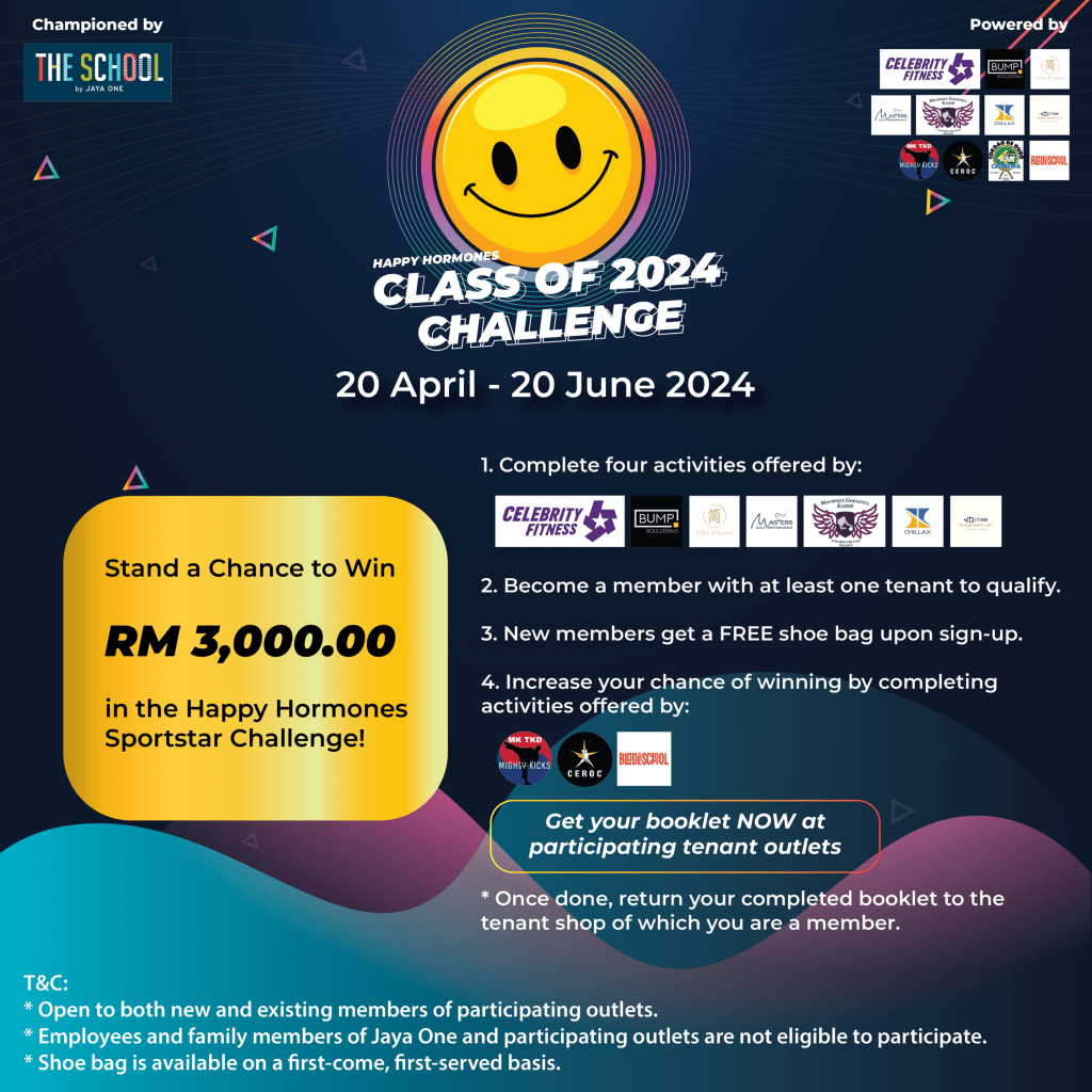 To demonstrate commitment, The School is launching the Happy Hormones Class of 2024 Challenge event, spanning three months from 20 April to 22 June 2024, located at Level 1, The School, Jaya One. Throughout this period, participants can take part in the Happy Hormones Sportstar Challenge for a chance to win a grand cash prize of RM3k. Simply join four activities offered by recreational tenants such as BUMP Bouldering, Jian Pilates, Celebrity Fitness, Magnifique Gymnastics, Masters Golf Performance, CHILLAX, and MeTime Book Cafe, and become a member with at least one tenant to qualify.