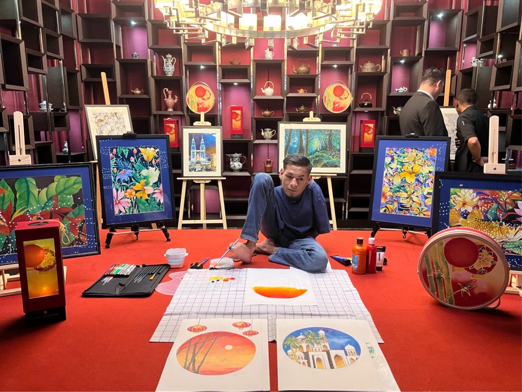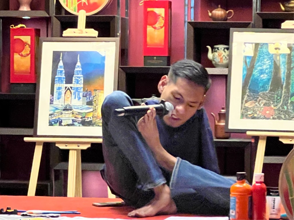 At a tender age, Encik Khairuddin mastered the art of brush strokes using his foot, experimenting on canvas, paper, and cloth by honing his craft in school. His work has been featured in numerous art exhibitions, including the Market Place for Creative Art showcase at the 6th World Islamic Economic Forum at the Kuala Lumpur Conference Centre. Despite being born without arms, he persevered against all odds, creating beautiful artworks painted using only his feet.