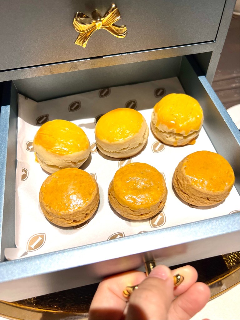 The set is served with plain & raisin scones, premium clotted cream, jam & marmalade and a choice of a Ronnefeldt tea blend selection, Pu’er or Tie Guan Yin tea.