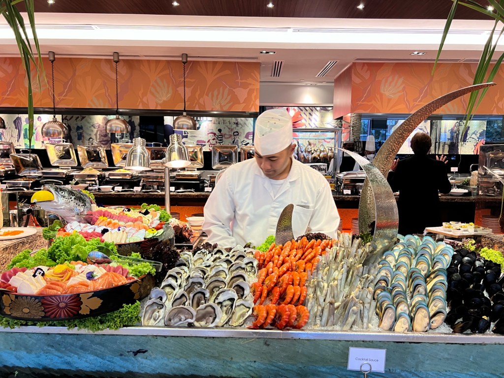The carving section is offering up savoury flavours of roasted lamb leg and crispy, golden salmon filo pastry. Indulge in yummy western dishes from penne seafood aglio olio, pan-fried lamb shoulder, mini chicken chop with garlic brown jus.