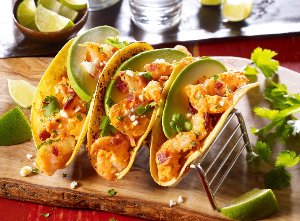 Lime Butter Shrimp Tacos (RM41.90): Lime butter sautéed shrimp, salsa, mozzarella, avocado, feta cheese, and lime.