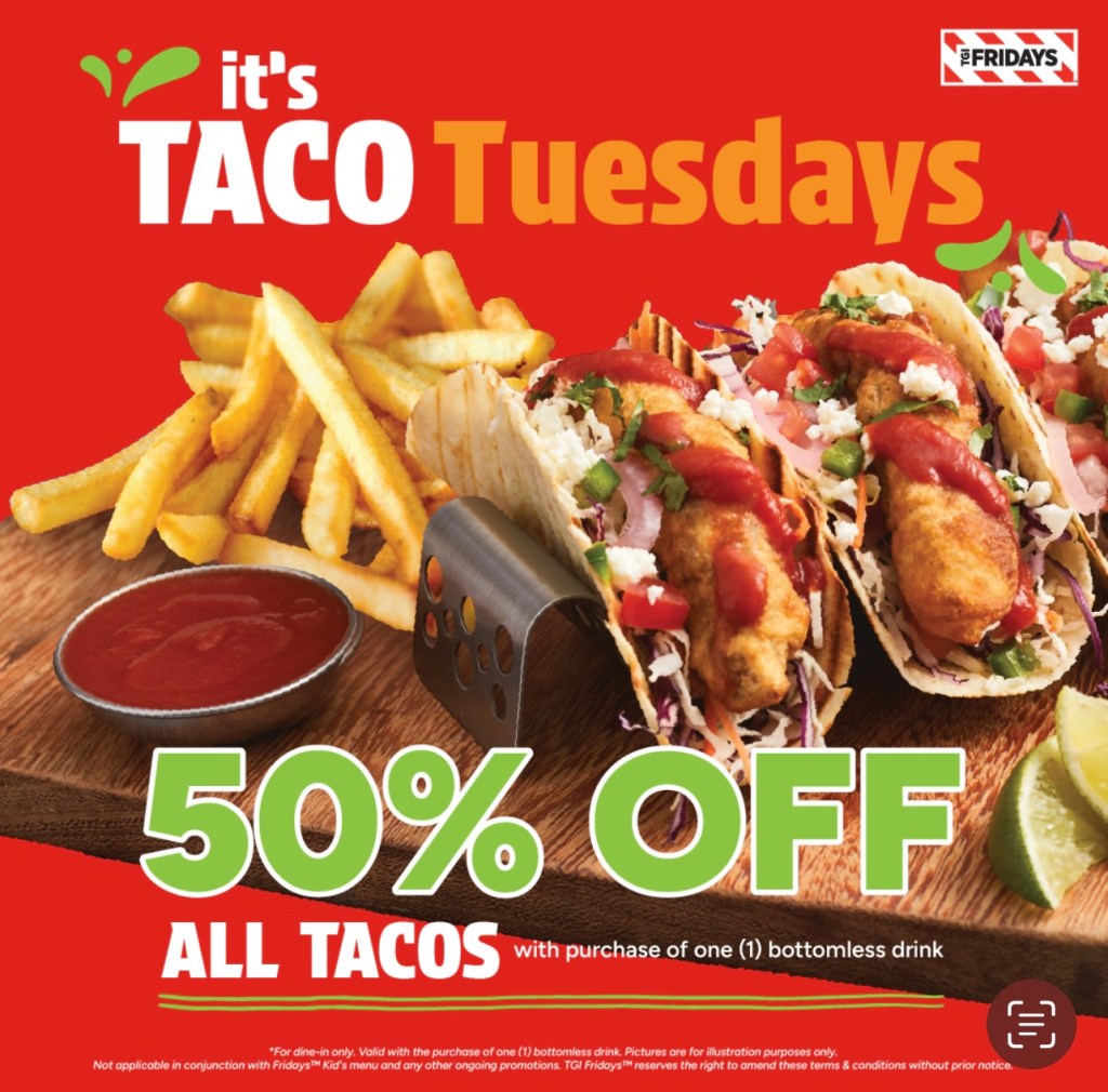 - Taco Tuesdays: Enjoy 50% off all tacos with the purchase of one (1) bottomless drink! Dive into the delicious selection of tacos, filled with tender meats, fresh veggies, and vibrant salsas. It’s a taco lover’s dream come true.