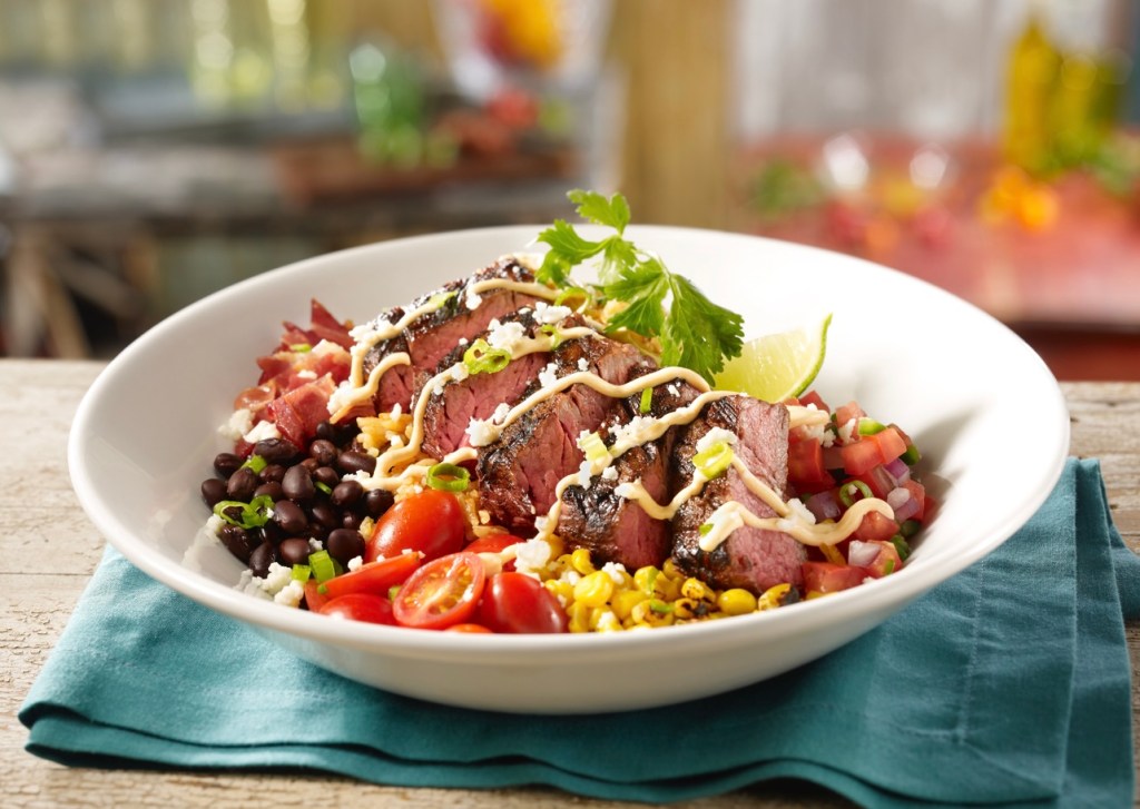 Grilled Striploin Mexi Bowl (RM65.90): Grilled sirloin with roasted corn, fresh avocado, black beans, cherry tomatoes, pico de gallo, Sriracha aioli, green onions, cilantro, and lime wedge.