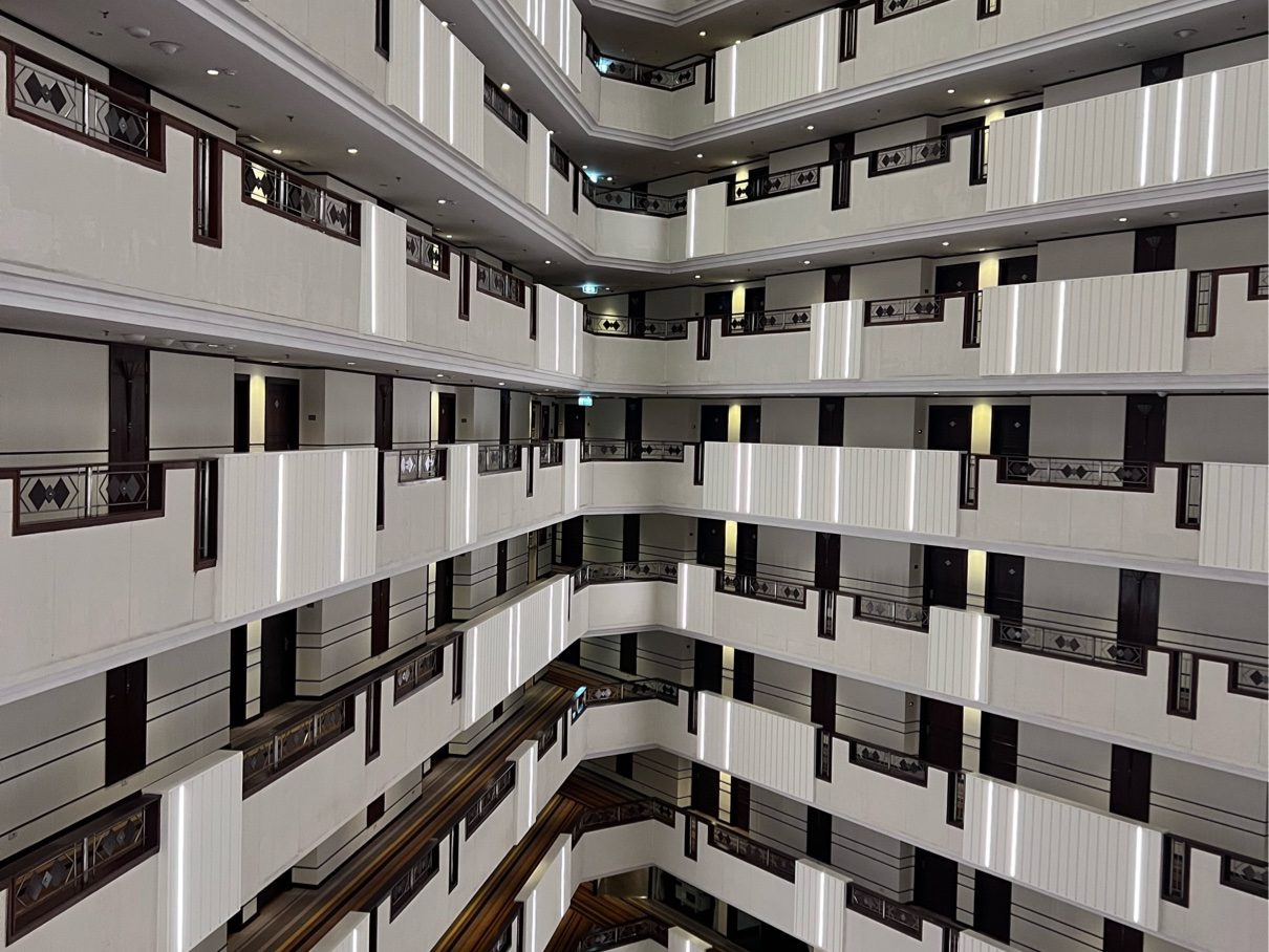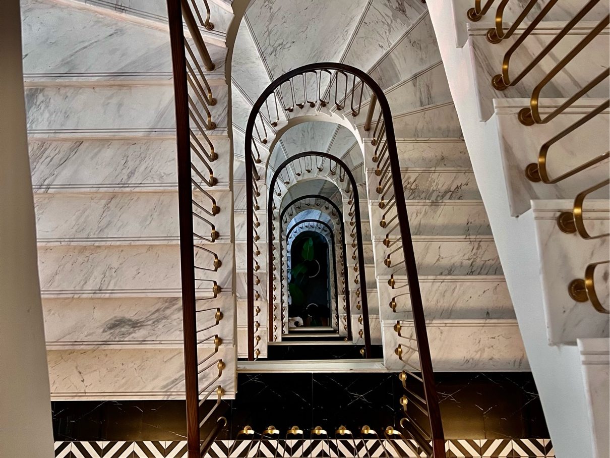 Curved lines are featured in the corners of the buildings, the walls of the guest rooms and the curved balcony staircases.