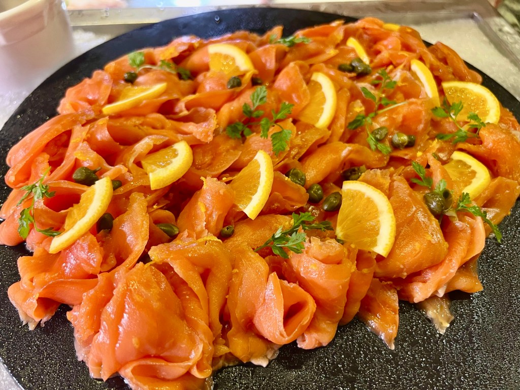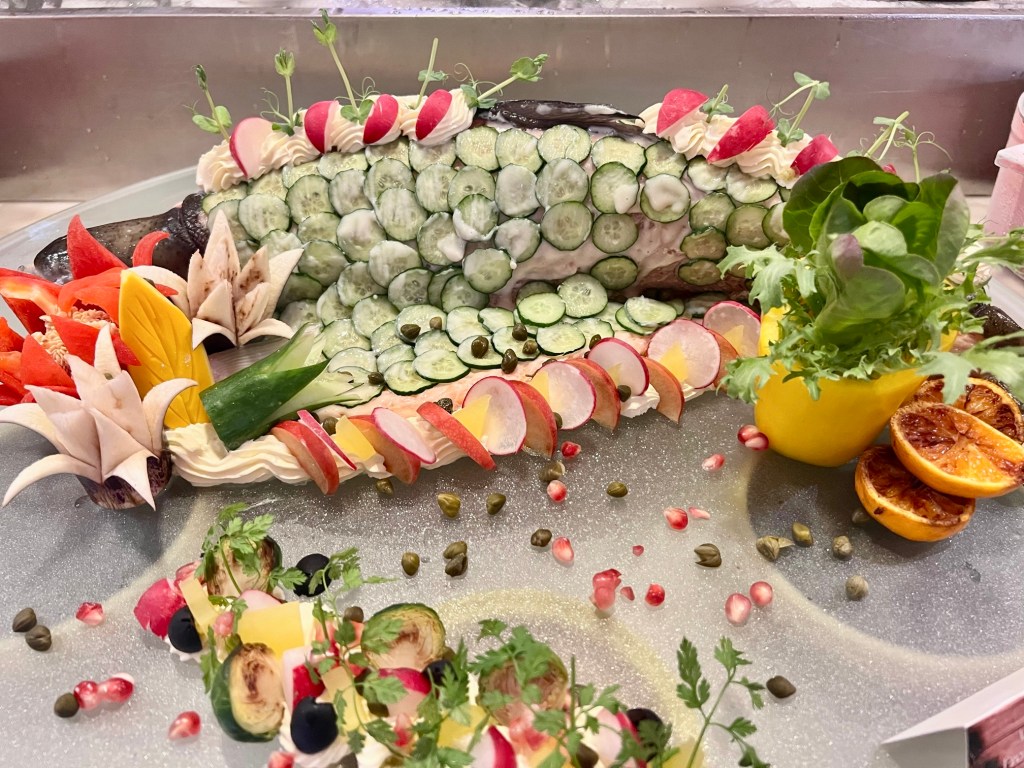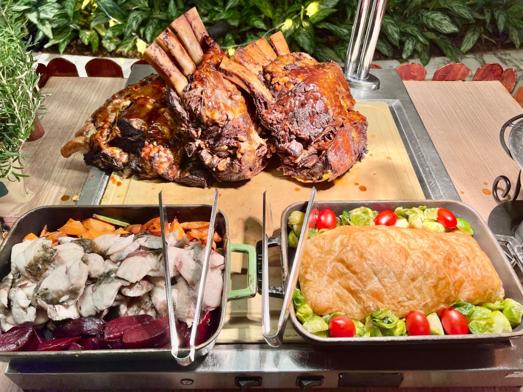 Taking centre stage at the buffet are the meat offerings at the carving station. Orange Roasted Whole Chicken and Spice Crusted Roasted Lamb Leg, Sticky Barbeque Beef Ribs and Salmon Coulibiac are amongst the offerings.