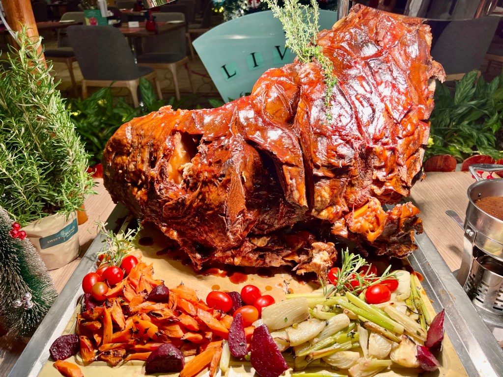 The star of the buffet this year is the 24-hour Slow Roasted Steamship (whole round) Beef Leg with Yorkshire Pudding and Grilled Vegetables. Complementing the succulent meat offerings are a host of accompaniments including Caramelized Vegetables and Apple Chestnut Stuffing, Parsley Potatoes, Roasted Provencal Vegetables and Brussels Sprouts, with an array of sauces – Mushroom, Cranberry, Natural Jus, Dill Cream, English Mustard and Horseradish Sauce.