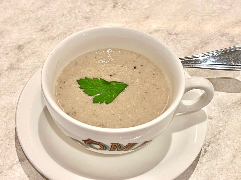 The meal is rounded out with a hearty mushroom soup and a side of sauteed vegetables.