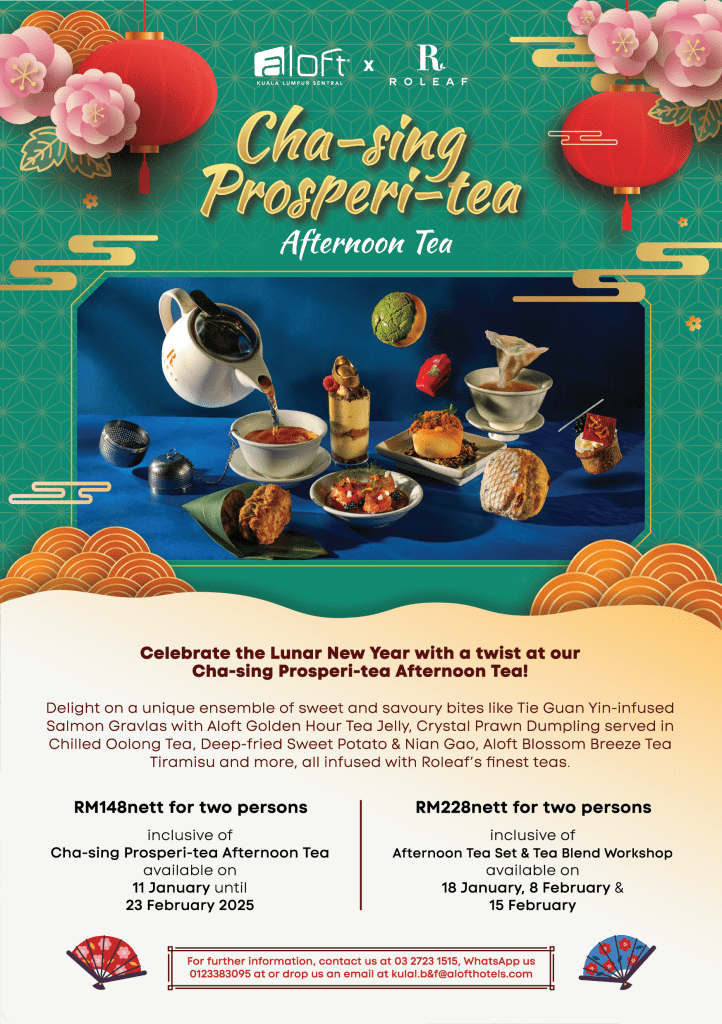 Guests can pair these delightful bites with Aloft’s signature Roleaf tea blends, including the Aloft Golden Hour and Aloft Blossom Breeze, adding an elegant touch to this afternoon affair. Available at W XYZ Bar from 11 January to 23 February 2025, indulge in the Cha-sing Prosperi-tea Afternoon Tea for RM148nett per two persons every Saturday & Sunday from 2:00PM to 5:00PM.