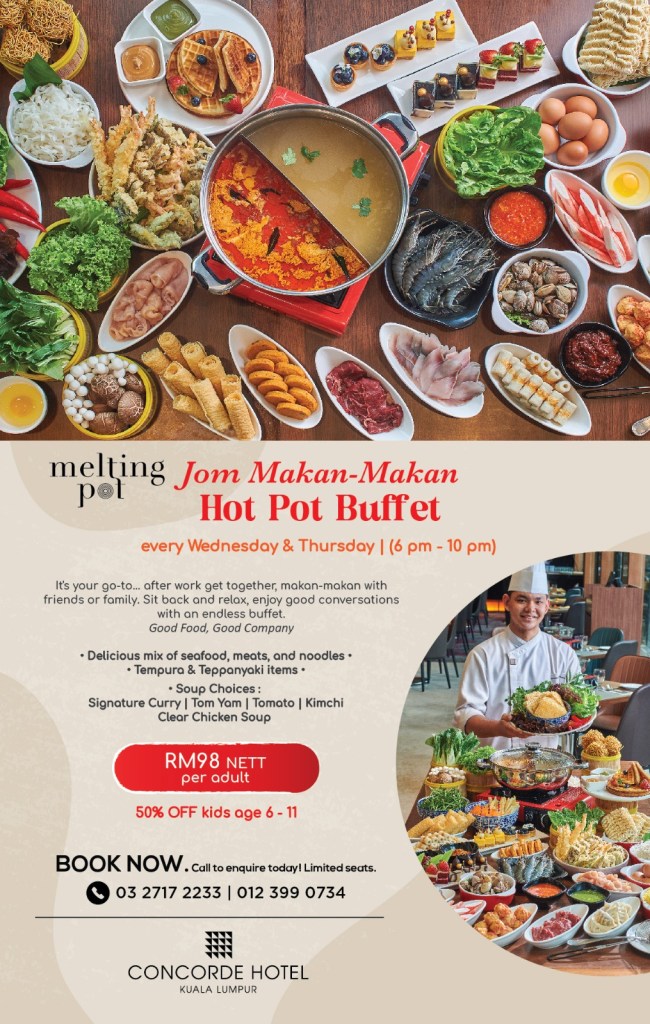 There’s something undeniably comforting about hot pot – the simmering broth, the sizzle of fresh meats hitting the pot, and the joy of gathering around the table to share a hearty meal. I recently had the pleasure of experiencing the Jom Makan-Makan Hot Pot Buffet at Melting Pot Café, Concorde Hotel Kuala Lumpur, and let me just say — it’s a hot pot lover’s dream come true.