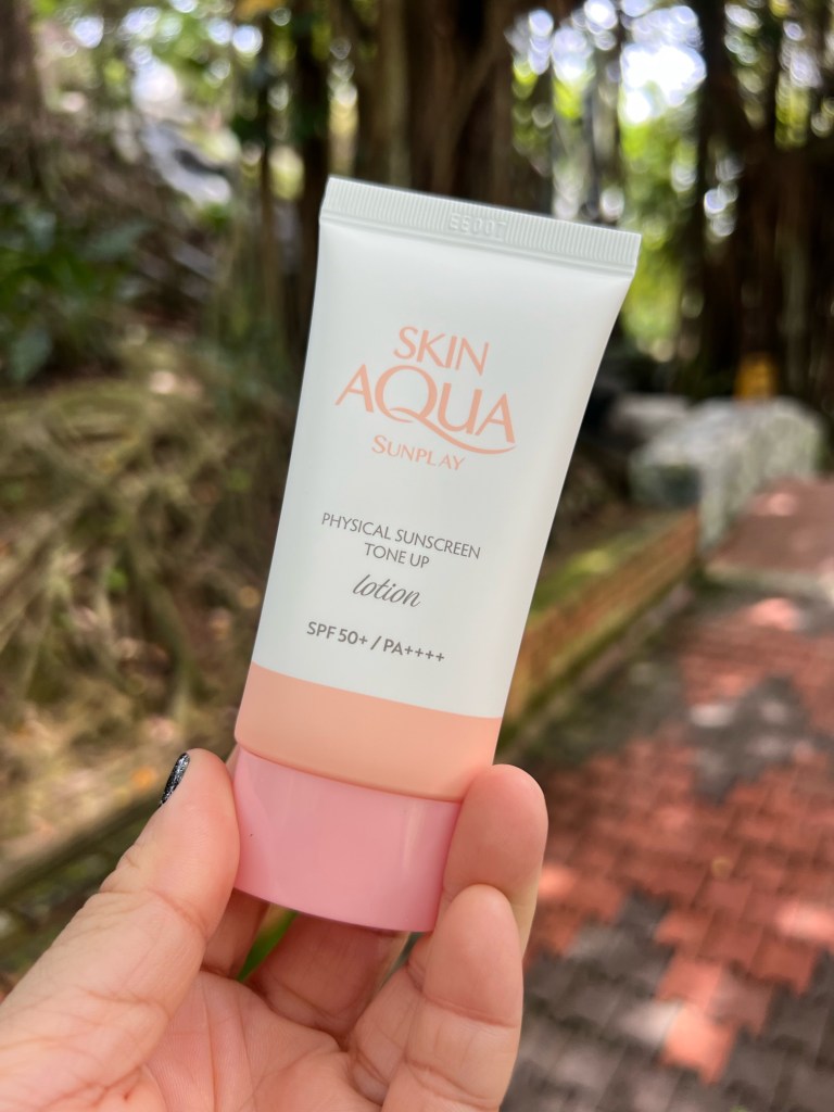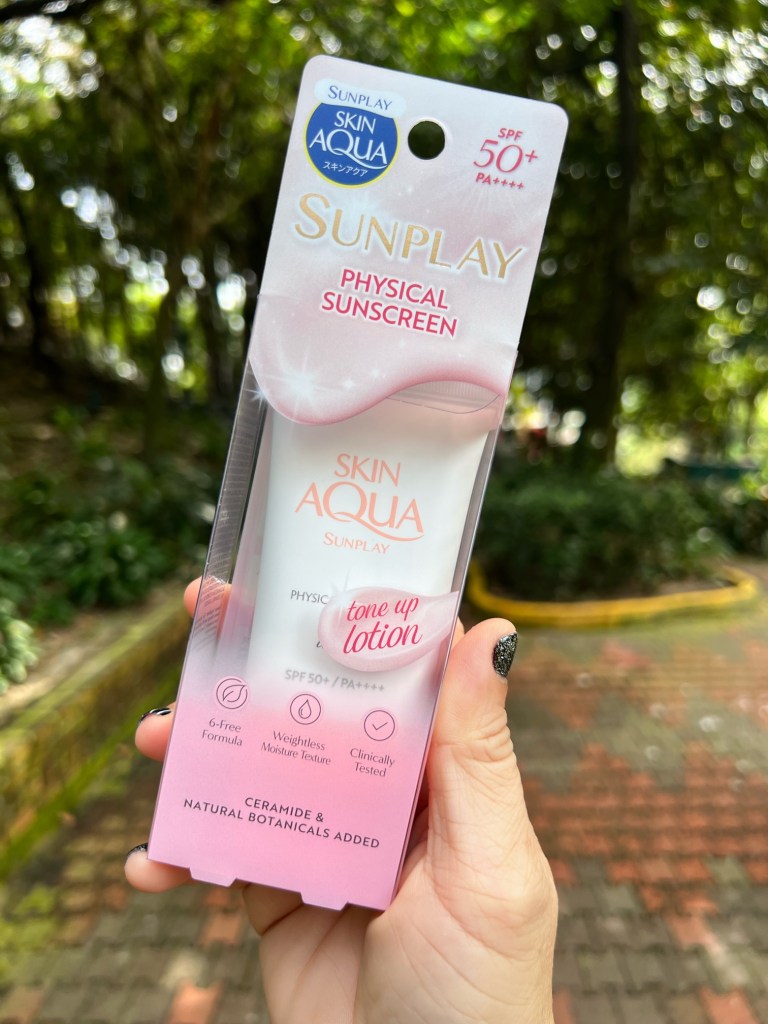 For this trip, I brought along my new favourite — the Sunplay Skin Aqua Physical Sunscreen Tone Up — and honestly, it was a game-changer. 🌸