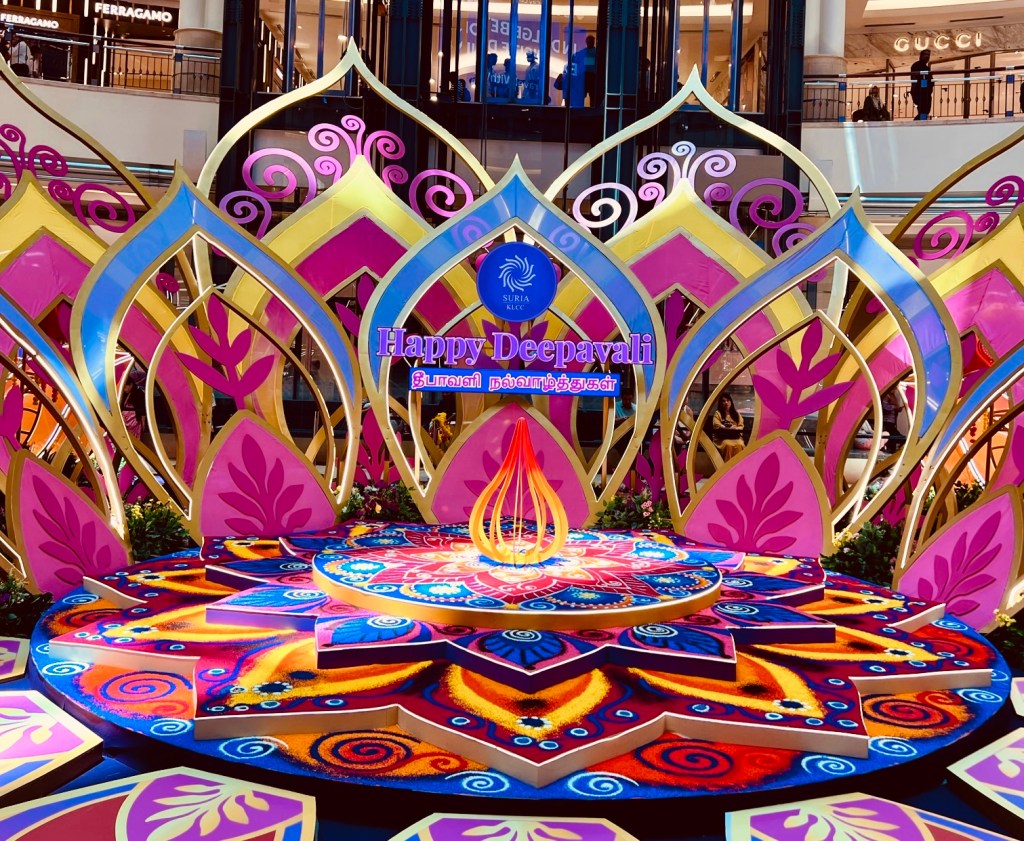When I stepped into Suria KLCC, it truly felt like walking into a luminous garden of light. The Centre Court is transformed into a breathtaking scene where art, culture, and celebration meet … the centrepiece, a giant illuminated lotus, surrounded by colourful kolam and glowing interactive lights.
