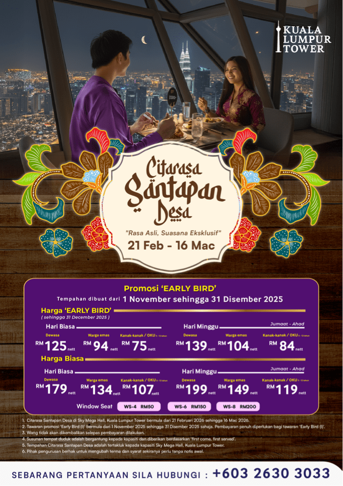 As Ramadan Al-Mubarak 1447 Hijrah approaches, Kuala Lumpur Tower proudly brings back one of the city’s most anticipated annual feasts,… Citarasa Santapan Desa: “Rasa Asli, Suasana Eksklusif”, happening from 21 February to 16 March 2026.